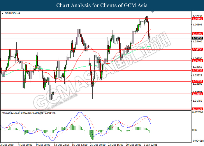 GBPUSD, H4: GBPUSD was traded lower following prior breakout below the previous support level at 1.3590. MACD which illustrated increasing bearish momentum suggest the pair to extend its loses toward support level at 1.3495.