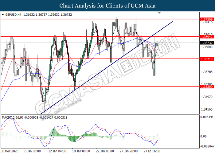 GBPUSD, H4: GBPUSD was traded higher following prior breakout above the previous resistance level at 1.3620. MACD which illustrated bullish bias momentum suggest the pair to extend its gains toward the resistance level at 1.3695.