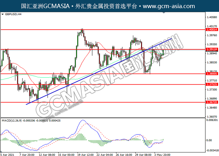 GBPUSD, H4: GBPUSD was traded higher while currently testing the resistance level at 1.3910. MACD which illustrated increasing bullish momentum suggest the pair to extend its gains after it successfully breakout above the resistance level.