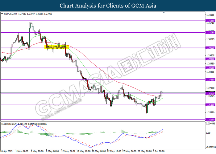 GBPUSD, H4: GBPUSD was traded higher following prior breakout above previous resistance level at 1.2690. MACD which display bullish signal suggest the pair to extend its gains towards the resistance level 1.2785.