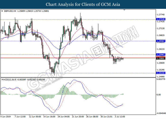 GBPUSD, H4: GBPUSD was traded flat near below the resistance level 1.2595. However, MACD which illustrate bullish bias signal with the starting formation of golden cross suggest the pair to be traded higher towards the resistance level 1.2610.