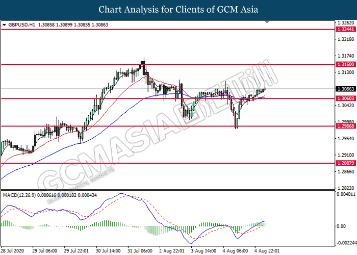 GBPUSD, H1: GBPUSD was traded higher following prior breakout above the previous resistance level at 1.3060. MACD which illustrate bullish bias momentum suggest the pair to extend its gains toward the resistance levle at 1.3150.