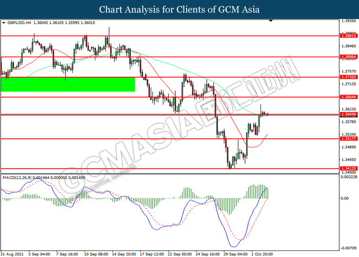 GBPUSD, H4: GBPUSD was traded higher while currently testing the resistance level at 1.3605. MACD which illustrated increasing bullish momentum suggest the pair to extend its gains after it successfully breakout above the resistance level.