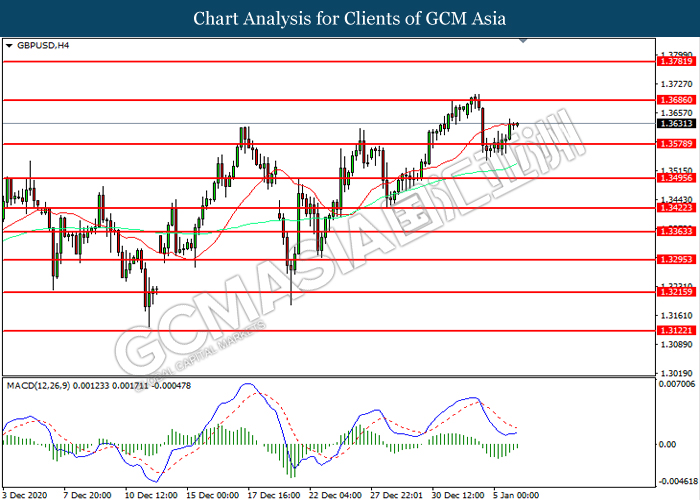 GBPUSD, H4: GBPUSD was traded higher following prior rebound from the support level at 1.3580. MACD which illustrated diminishing bearish momentum suggest the pair to extend its gains toward resistance level at 1.3685.