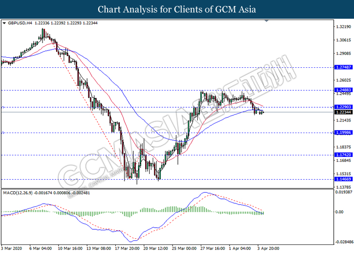 GBPUSD, H4: GBPUSD was traded flat near the resistance level 1.2290 following prior breakout below previous support level. However, MACD which illustrate persistent bearish momentum signal suggest the pair to extend its losses towards the support level 1.1990.