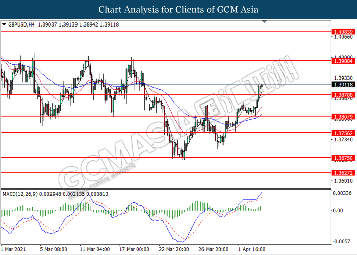 GBPUSD, H4: GBPUSD was traded higher following prior breakout above the previous resistance level at 1.3880. MACD which illustrated bullish bias momentum suggest the pair to extend its gains toward the resistance level at 1.3990.