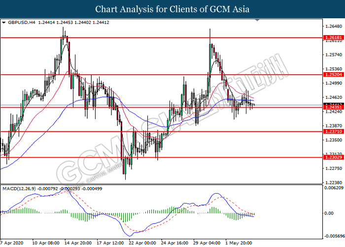 GBPUSD, H4: GBPUSD was traded lower while currently testing the support level at 1.2435. However, MACD which illustrates diminishing bearish momentum signal suggest the pair to be traded higher in short term.