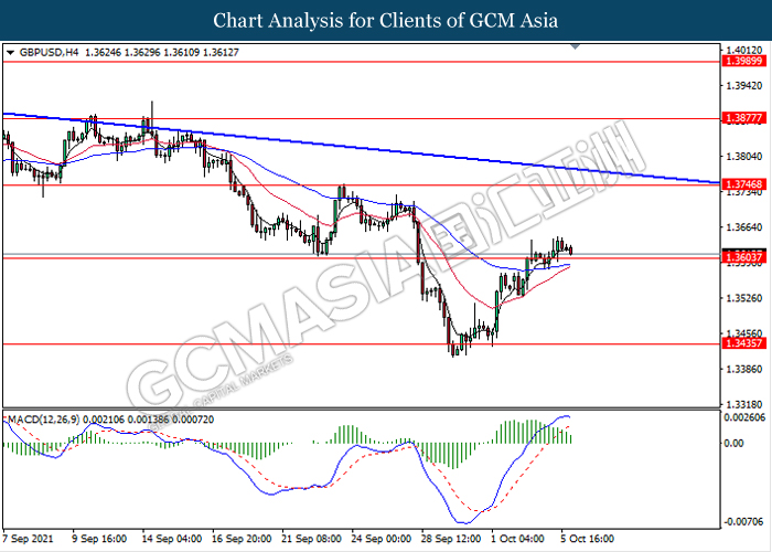 GBPUSD, H4: GBPUSD was traded lower while currently testing the support level 1.3605. MACD which illustrate diminishing bullish momentum signal suggest the pair to extend its losses after it breaks below the support level 1.3605.