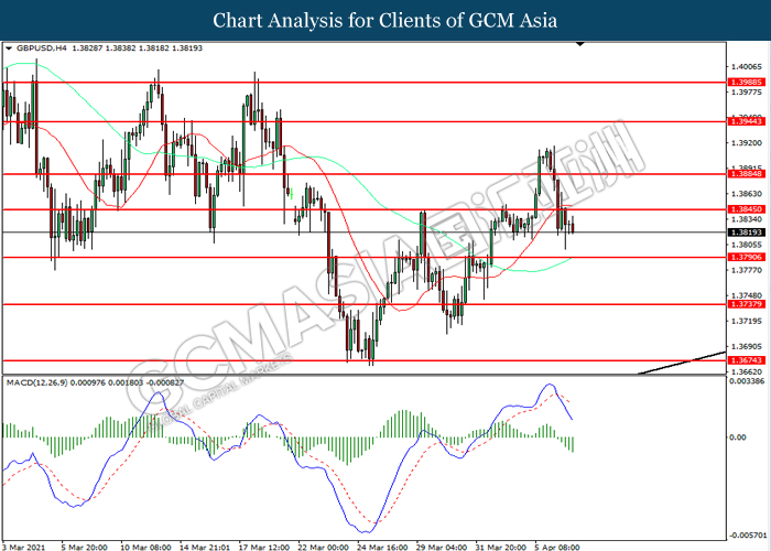 GBPUSD, H4: GBPUSD was traded lower following prior breakout below the previous support level at 1.3845. MACD which illustrated increasing bearish momentum suggest the pair to extend its losses toward support level at 1.3790.