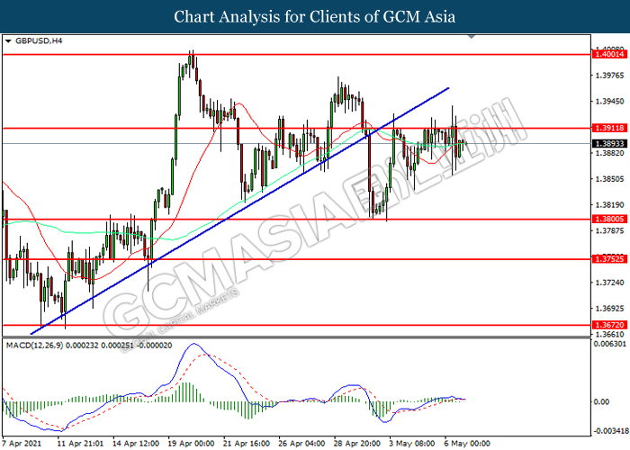 GBPUSD, H4: GBPUSD was traded lower following prior retracement from the resistance level at 1.3910. MACD which illustrated diminishing bullish momentum suggest the pair to extend its losses toward support level at 1.3800.
