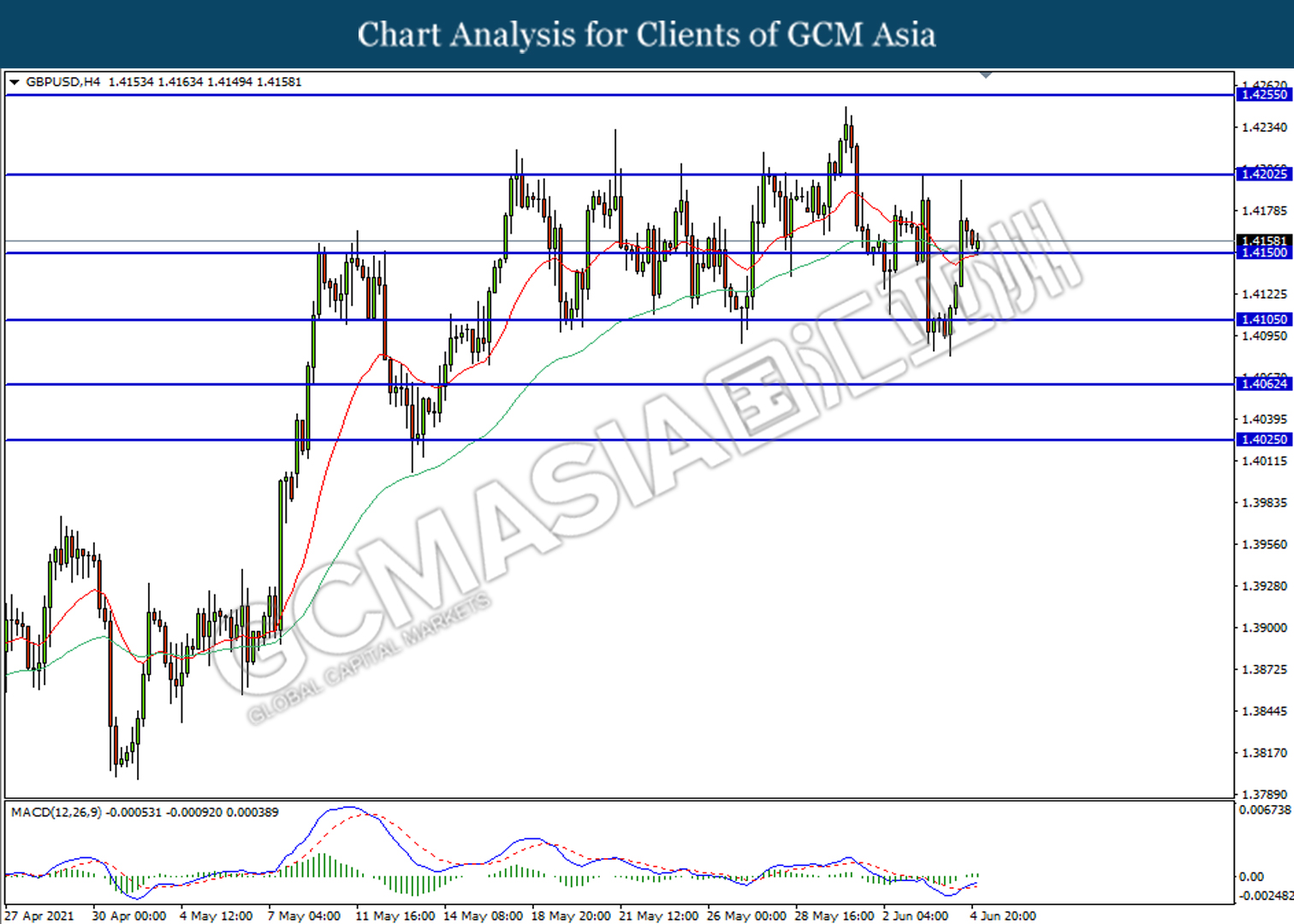 GBPUSD, H4: GBPUSD was traded higher while currently testing the support level at 1.4150. MACD which illustrated the formation of bullish momentum suggest the pair to extend its gains after a successful rebound from the support level.