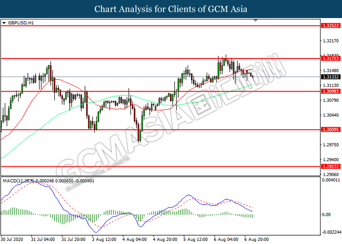 GBPUSD, H1: GBPUSD was traded lower following prior retracement from the resistance level at 1.3175. MACD which illustrated increasing bearish momentum suggest the pair to extend its losses toward support level at 1.3090.