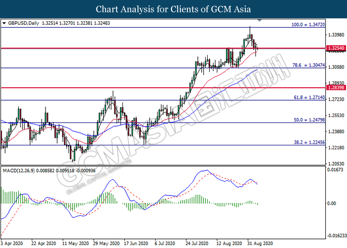 GBPUSD, Daily: GBPUSD was traded lower while currently testing the support level at 1.3255. MACD which illustrated bearish bias momentum suggest the pair to extend its losses after it successfully breakout below the support level at 1.3255.