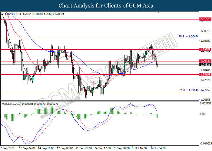GBPUSD, H4: GBPUSD was traded lower following prior breakout below the previous support level at 1.2905. MACD which illustrates bearish bias momentum suggest the pair to extend its losses toward the support level at 1.2820.