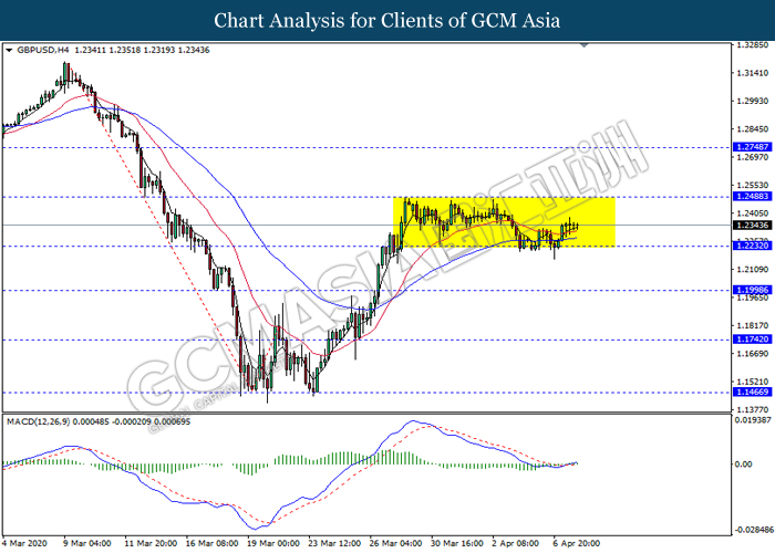 GBPUSD, H4: GBPUSD remain traded in a sideway channel following recent rebound from the support level 1.2230. However, MACD which display bullish bias signal with the formation of golden cross suggest the pair to extend its rebound in short term towards the resistance level 1.2490.
