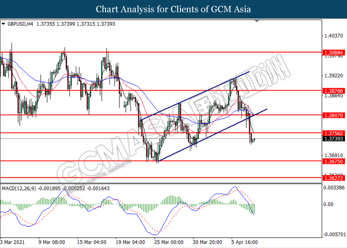 GBPUSD, H4: GBPUSD was traded lower following prior breakout below the previous support level at 1.3755. MACD which illustrated bearish bias momentum suggest the pair to extend its losses toward the support level at 1.3675.