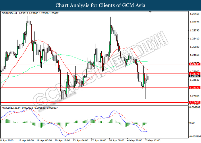GBPUSD, H4: GBPUSD was traded higher while currently testing the resistance level at 1.2375. MACD which illustrated diminishing bearish momentum suggest the pair to extend its gains after it successfully breakout above the resistance level.