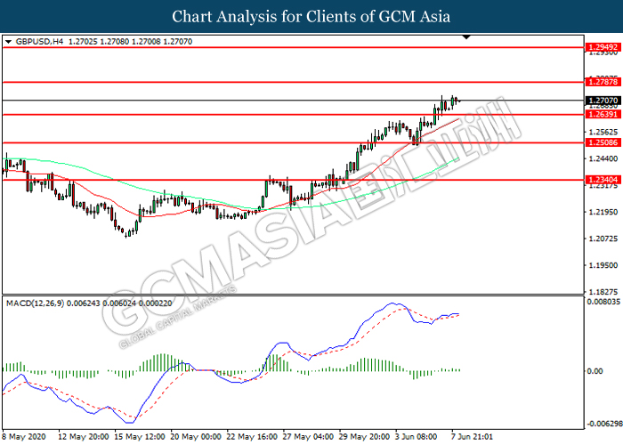 GBPUSD, H4: GBPUSD was traded higher following prior breakout above the previous resistance level at 1.2640. However, MACD which illustrated diminishing bullish momentum suggest the pair to be traded lower in short-term as technical correction.