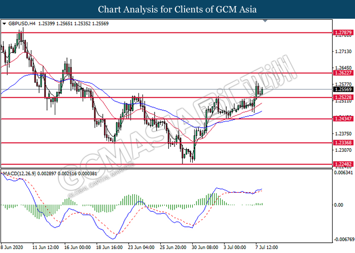 GBPUSD, H4: GBPUSD was traded higher following prior rebound from the support level at 1.2525. MACD which illustrate bullish bias momentum suggest the pair to extend its gains toward the resistance level at 1.2625.