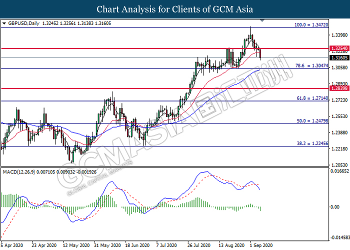 GBPUSD, Daily: GBPUSD was traded lower following prior breakout below the previous support level at 1.3255. MACD which illustrated bearish bias momentum suggest the pair to extend its losses toward the support level at 1.3045.
