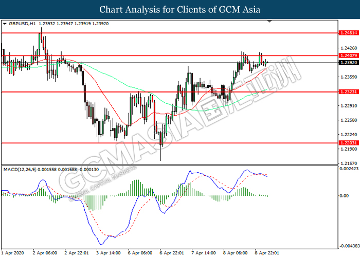 GBPUSD, H1: GBPUSD was traded lower following prior retracement from the resistance level at 1.2410. MACD which illustrated increasing bearish momentum suggest the pair to extend its losses toward support level at 1.2325.