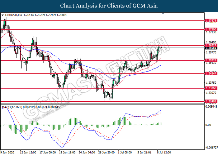 GBPUSD, H4: GBPUSD was traded higher while currently testing the resistance level at 1.2625. MACD which illustrate bullish bias momentum suggest the pair to extend its gains after it successfully breakout above the resistance level at 1.2625.