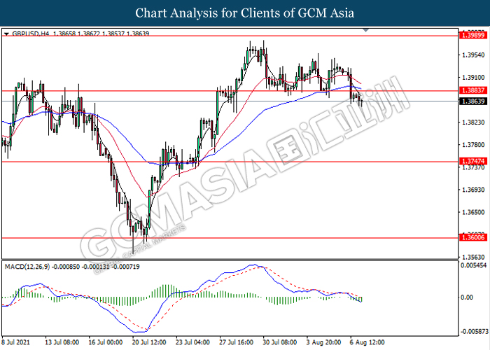 GBPUSD, H4: GBPUSD was traded lower following prior breakout below the previous support level 1.3885. MACD which illustrate bearish bias signal suggest the pair to extend its losses towards the support level 1.3745.