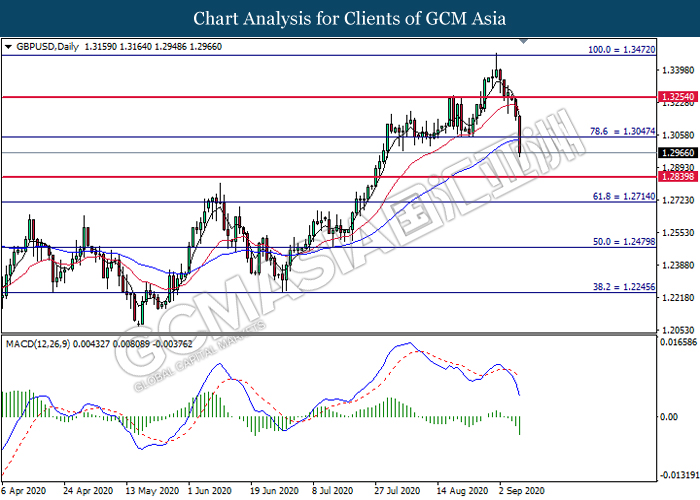GBPUSD, Daily: GBPUSD was traded lower while currently testing the support level at 1.3045. MACD which illustrated bearish bias momentum suggest the pair to extend its losses after it successfully close its candle below the support level.