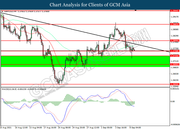 GBPUSD, H4: GBPUSD was traded lower while currently testing the support level at 1.3760. However, MACD which illustrated diminishing bearish momentum suggest the pair to be traded higher in short-term as technical correction.