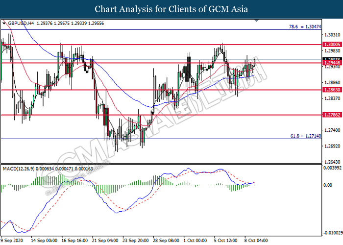 GBPUSD, H4: GBPUSD was traded higher while currently testing the resistance level at 1.2945.  MACD which illustrates bullish bias momentum suggest the pair to extend its gains after it successfully breakout above the resistance level at 1.2945.