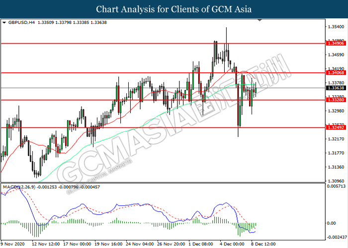 GBPUSD, H4: GBPUSD was traded higher following prior rebound from the support level at 1.3330. MACD which illustrated diminishing bearish momentum suggest the pair to extend its gains toward resistance level at 1.3405.