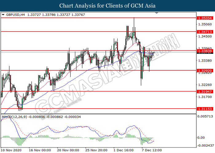GBPUSD, H4: GBPUSD was traded higher while currently testing the resistance level at 1.3385. MACD which illustrates diminishing bearish momentum signal suggest the pair to extend its gains after it successfully breakout above the resistance level at 1.3385.