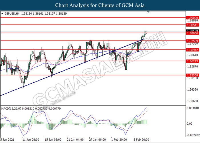 GBPUSD, H4: GBPUSD was traded higher following prior breakout above the previous resistance level at 1.3800. MACD which illustrated bullish bias momentum suggest the pair to extend its gains toward the resistance level at 1.3855.