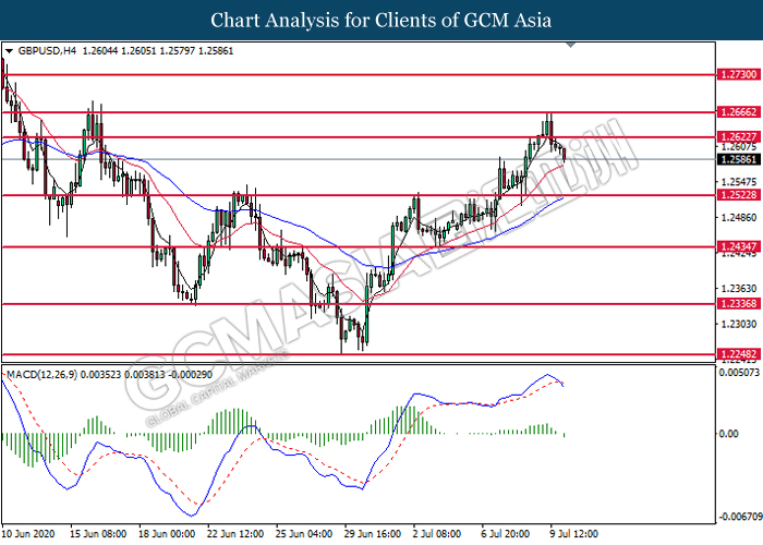 GBPUSD, H4: GBPUSD was traded lower following prior breakout below the previous support level at 1.2625. MACD which illustrate bearish momentum with the formation of death cross suggest the pair to extend its losses toward the support level at 1.2525.