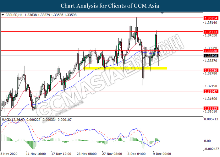 GBPUSD, H4: GBPUSD was traded lower following prior breakout below the previous support level at 1.3385. MACD which illustrates diminishing bullish momentum signal suggest the pair to extend its losses toward the support level at 1.3290.
