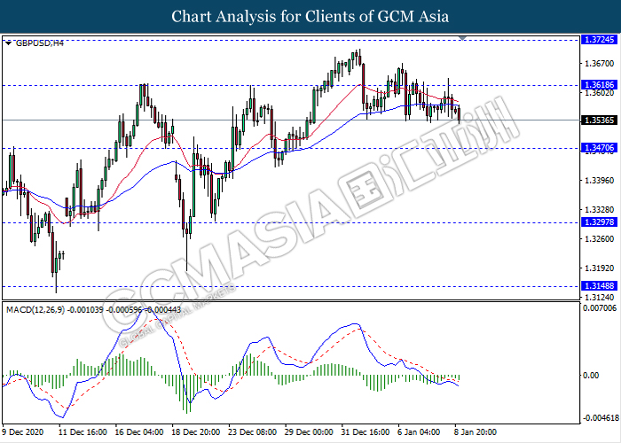 GBPUSD, H4: GBPUSD was traded lower following prior retracement from the resistance level 1.3620. MACD which display ongoing bearish momentum signal suggest the pair to extend its losses towards the support level 1.3470.