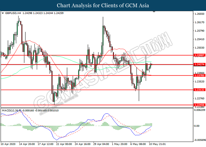 GBPUSD, H4: GBPUSD was traded higher while currently testing the resistance level at 1.2425. MACD which illustrated increasing bullish momentum suggest the pair to extend its gains after it successfully breakout above the resistance level.