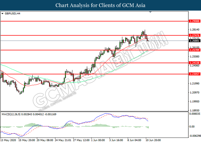 GBPUSD, H4: GBPUSD was traded lower following prior retracement from the resistance level at 1.2745. MACD which illustrated increasing bearish momentum suggest the pair to extend its losses toward support level at 1.2580.