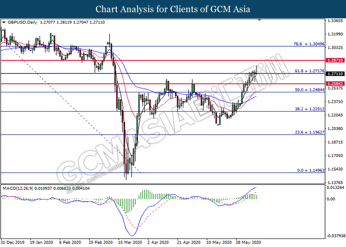 GBPUSD, Daily: GBPUSD was traded higher while currently testing the resistance level at 1.2720. However, MACD which illustrate diminishing bullish momentum suggest the pair to undergo technical correction toward the support level at 1.2485.