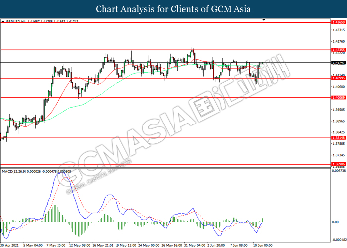 GBPUSD, H4: GBPUSD was traded higher following prior rebound from the support level at 1.4100. MACD which illustrated increasing bullish momentum suggest the pair to extend its gains toward resistance level at 1.4235.