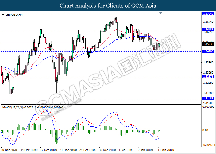 GBPUSD, H4: GBPUSD was traded higher following prior rebound from the support level 1.3470. MACD which illustrate diminishing bearish momentum signal suggest the pair to extend its rebound towards the resistance level 1.3620.