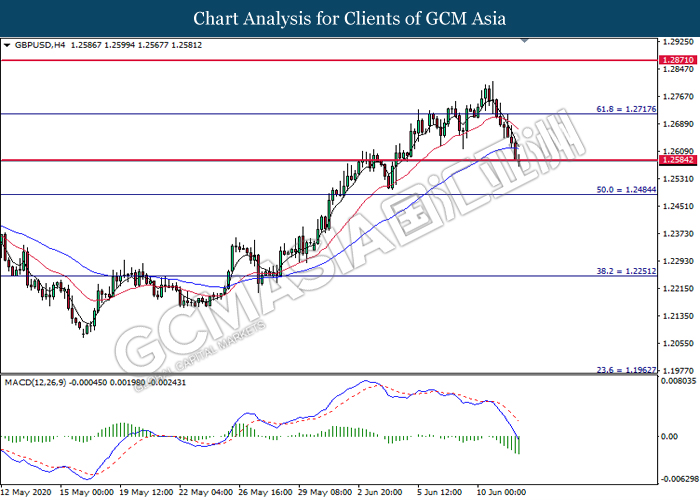 GBPUSD, H4: GBPUSD was traded lower while currently testing the support level at 1.2585. MACD which illustrate bearish bias momentum suggest the pair to extend its losses after it successfully breakout below the support level.