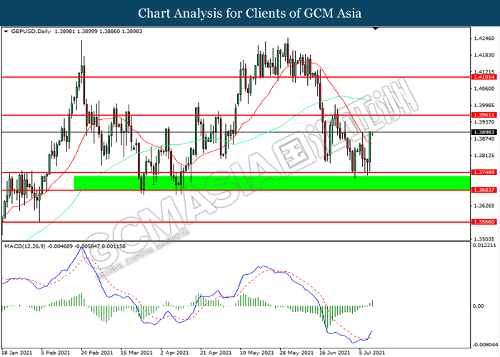 GBPUSD, Daily: GBPUSD was traded higher following prior rebound from the support level at 1.3750. MACD which illustrated increasing bullish momentum suggest the pair to extend its gains toward resistance level at 1.3960.