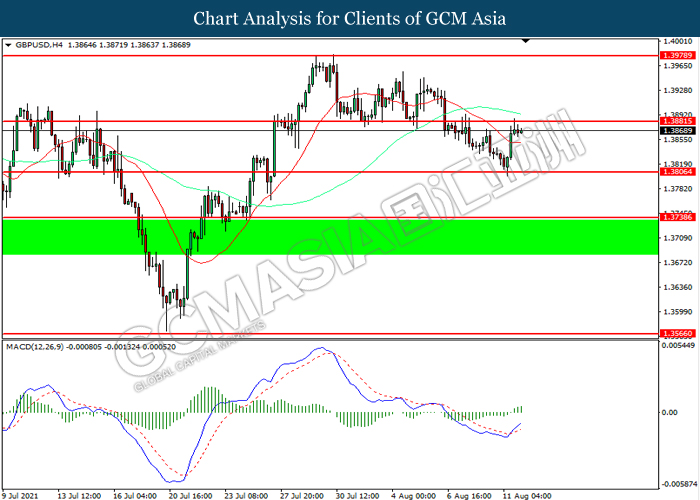 GBPUSD, H4: GBPUSD was traded higher while currently testing the resistance level at 1.3880. MACD which illustrated increasing bullish momentum suggest the pair to extend its gains after it successfully breakout above the resistance level.