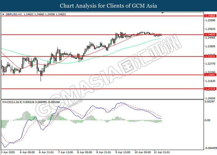 GBPUSD, H1: GBPUSD was traded within a range while currently testing the resistance level at 1.2465. MACD which illustrated diminishing bearish momentum suggest the pair to extend its gains after it successfully breakout above the resistance level.