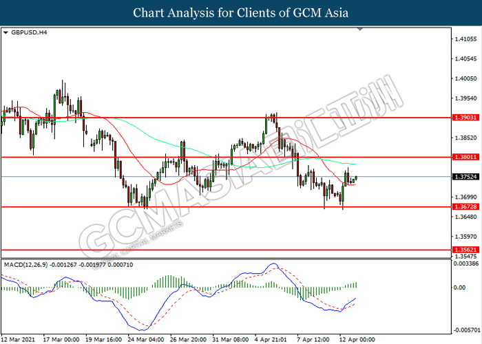 GBPUSD, H4: GBPUSD was traded higher following prior rebound from the support level at 1.3675. MACD which illustrated increasing bullish momentum suggest the pair to extend its gains toward resistance level at 1.3800.