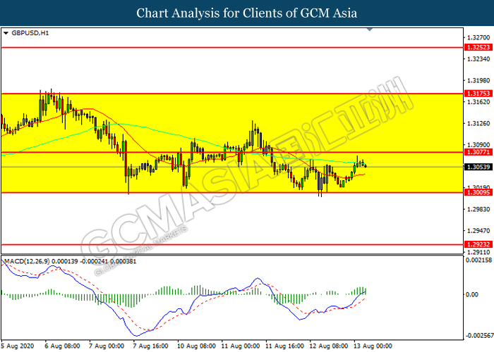 GBPUSD, H1: GBPUSD was traded higher while currently near the resistance level at 1.3075. However, MACD which illustrated diminishing bullish momentum suggest the pair to be traded lower in short-term as technical correction.