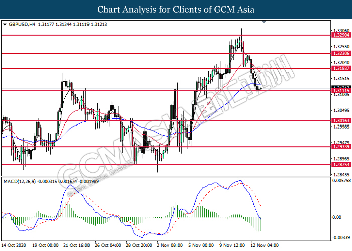 GBPUSD, H4: GBPUSD was traded lower while currently testing the support level at 1.3110. MACD which illustrates bearish bias momentum suggest the pair to extend its losses after it successfully breakout below the support level at 1.3110.