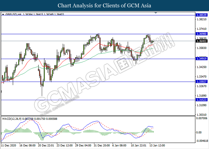 GBPUSD, H4: GBPUSD was traded lower following prior retracement from the resistance level 1.3700. MACD which illustrate diminishing bullish momentum signal suggest the pair to extend its retracement towards the support level 1.3490.