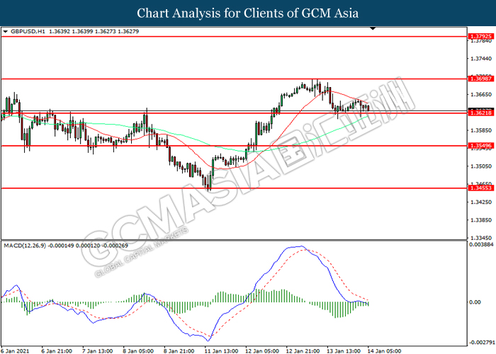 GBPUSD, H1: GBPUSD was traded lower while currently testing the support level at 1.3620. MACD which illustrated increasing bearish momentum suggest the pair to extend its losses after it successfully breakout below the support level.